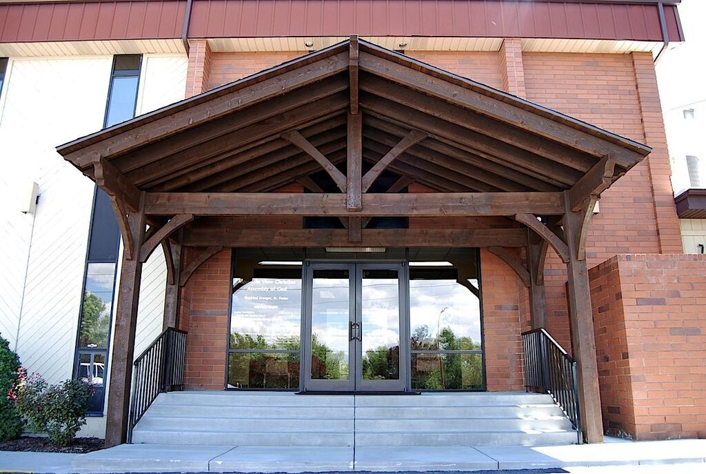 Front view of Church with freestanding timber frame pavilion kit installed for shade.